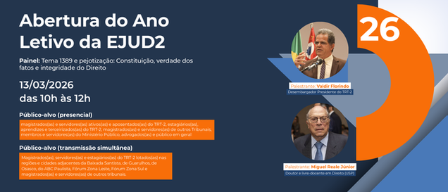 Público-alvo (transmissão simultânea): magistrados(as), servidores(as) e estagiários(as) do TRT-2 lotados(as) nas regiões e cidades adjacentes da Baixada Santista, de Guarulhos, de Osasco, do ABC Paulista, Fórum Zona Leste, Fórum Zona Sul e magistrados(as) e servidores(as) de outros tribunais
