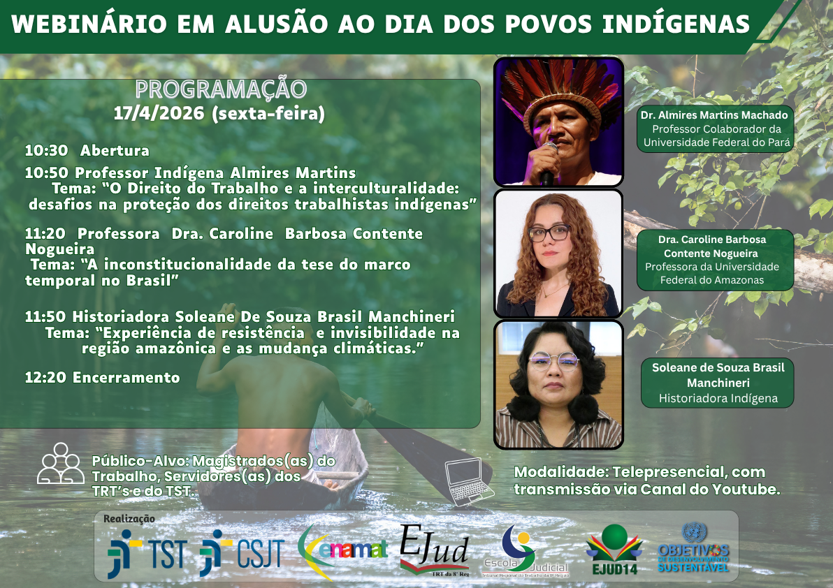 A Escola Judicial do Tribunal Regional do Trabalho da 2ª Região (EJUD2) divulga a realização do webinário em alusão ao Dia dos Povos Indígenas, que ocorrerá no dia 17 de abril de 2026, das 10h30 às 12h30, na modalidade telepresencial, com transmissão pelo canal da ENAMAT no YouTube. A iniciativa integra o Ciclo de Webinários Temáticos, no âmbito do Sistema Nacional de Formação e Aperfeiçoamento de Magistrados do Trabalho (SINFOMAT), e será realizada em parceria com as Escolas Judiciais dos Tribunais Regionais do Trabalho da 8ª, 11ª e 14ª Regiões, além do Conselho Superior da Justiça do Trabalho (CSJT) e do Tribunal Superior do Trabalho (TST).