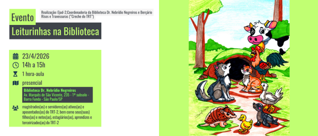 A Escola Judicial da 2ª Região (Ejud2) realizará, no dia 23 de abril, das 14h às 15h, um evento que incentiva a leitura de livros. Com uma abordagem mais lúdica, voltada para o público infantil, o Leiturinhas ocorrerá na Biblioteca Dr. Nebrídio Negreiros, localizada no 10º andar do Fórum Ruy Barbosa.