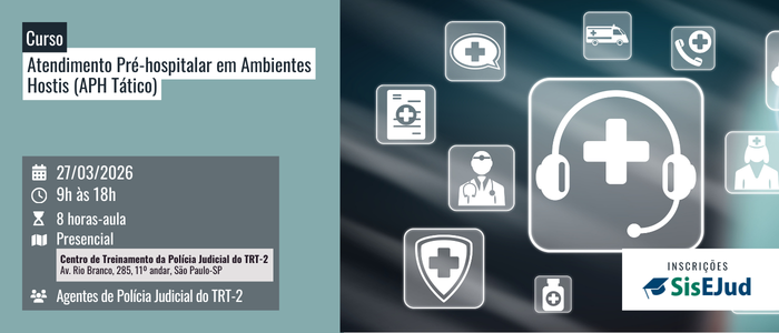 A Escola Judicial do Tribunal Regional do Trabalho da 2ª Região (EJUD2), em parceria com a Secretaria de Segurança Institucional do TRT-2, realizará em 27 de março de 2026, das 9h às 18h, o curso presencial Atendimento Pré-hospitalar em Ambientes Hostis (APH Tático) no Centro de Treinamento da Polícia Judicial do TRT-2.