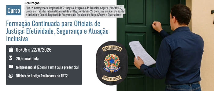 A Escola Judicial do Tribunal Regional do Trabalho da 2ª Região (EJUD2) promoverá o curso Formação Continuada para Oficiais de Justiça: Efetividade, Segurança e Atuação Inclusiva, na modalidade presencial e telepresencial (Zoom), com carga horária de 26,5 horas-aula, entre os dias 5 de maio e 22 de junho de 2026.