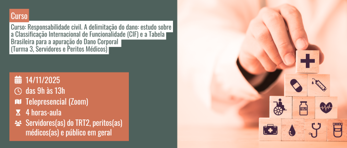 No dia 14, o curso será oferecido em turma única, das 9 às 13h, sendo aberto a servidores(as) do TRT-2, peritos(as) médicos(as) e público em geral.