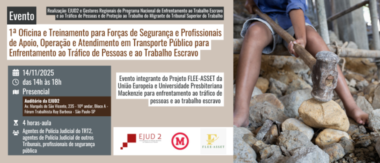 Capacitar profissionais de segurança pública e agentes de polícia judicial do TRT2 para atender ao fluxo nacional de enfrentamento ao trabalho escravo e tráfico de pessoas, na forma do Programa Nacional de Enfrentamento ao Trabalho Escravo e ao Tráfico de Pessoas e de Proteção ao Trabalho do Migrante do Tribunal Superior do Trabalho