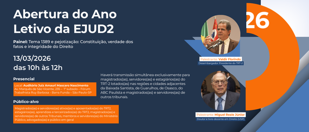 Público-alvo (transmissão simultânea): magistrados(as), servidores(as) e estagiários(as) do TRT-2 lotados(as) nas regiões e cidades adjacentes da Baixada Santista, de Guarulhos, de Osasco, do ABC Paulista e magistrados(as) e servidores(as) de outros tribunais