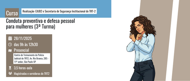 O curso de defesa pessoal feminina para magistradas e servidoras do TRT2 visa capacitar as participantes a reconhecer situações de risco, desenvolver técnicas preventivas, aprimorar a autoconfiança e aprender movimentos simples e eficazes de autodefesa. Além disso, busca promover a gestão emocional em situações de conflito, incentivar a cultura de proteção coletiva, orientar sobre direitos e procedimentos legais e proporcionar vivências práticas por meio de simulações que reforcem a segurança e a aplicação das técnicas ensinadas.