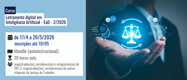 O curso de Letramento Digital em Inteligência Artificial é uma capacitação estratégica desenvolvida especificamente para os profissionais da Justiça do Trabalho da 2ª Região.