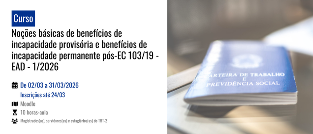 O curso é destinado a magistrados, servidores e estagiários de Direito interessados em compreender como os benefícios por incapacidade foram transformados, incluindo a renomeação do auxílio-doença para benefício por incapacidade provisória e a aposentadoria por invalidez para benefício por incapacidade permanente.