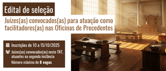O presente edital tem como objetivo selecionar juízes(as) convocados(as) que atuem na segunda instância para compor o grupo de facilitadores(as) que conduzirá atividades nas Oficinas de Precedentes na Justiça do Trabalho.