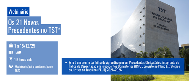 Para possibilitar o fortalecimento da cultura de precedentes e a consolidação das metas estratégicas da Justiça do Trabalho ainda em 2025, a EJUD2 irá ofertar os “Webinários Temáticos sobre Precedentes no Processo do Trabalho”, na modalidade a distância (de modo assíncrono, na plataforma Moodle), no período de 1º a 15 de dezembro de 2025.