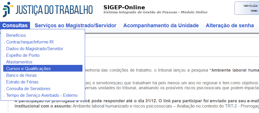 A informação pode ser obtida por meio do SIGEP no meu Consultas. Compartilhamos, para facilitar o acesso, as seguintes telas: