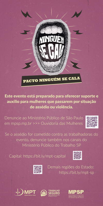 Nas festividades do carnaval, banners da campanha (veja abaixo) espalhados por pontos de grande circulação levarão quem necessita de auxílio aos canais de denúncia como a Ouvidoria das Mulheres, do MPSP. Em caso de violência contra trabalhadoras dos eventos, a denúncia pode ser feita também ao MPT, por meio dos links divulgados em QR codes nesses mesmos materiais (capital e outras regiões do Estado).