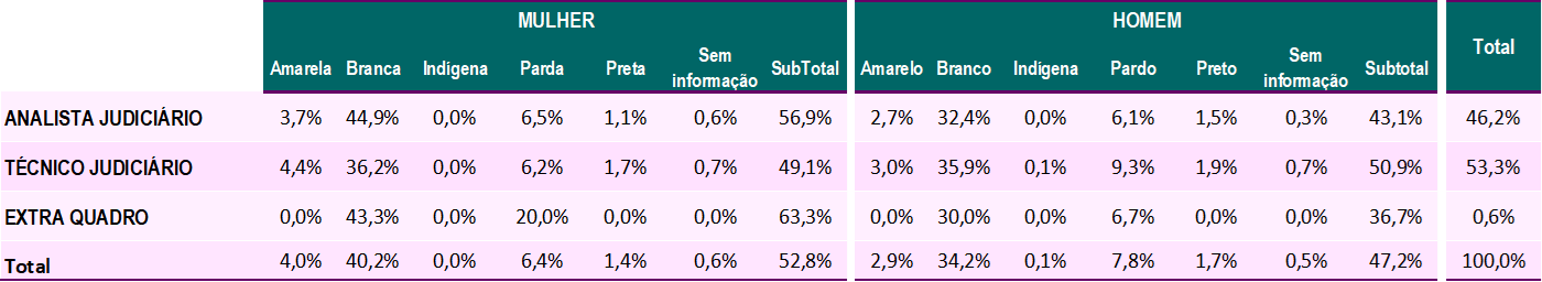 Fonte: Tabelas elaboradas pela Coordenadoria de Estatística com dados do Sistema Integrado de Gestão de Pessoas – SIGEP online e da Secretaria de Convocação e Informações Funcionais de Magistrados(as).