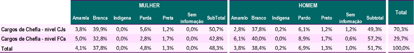 Distribuição percentual de cargos e funções comissionadas de chefia de unidade, ocupadas por servidores(as), por gênero e raça/cor Janeiro/2026